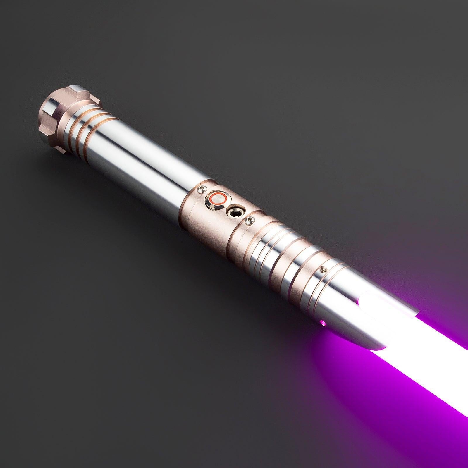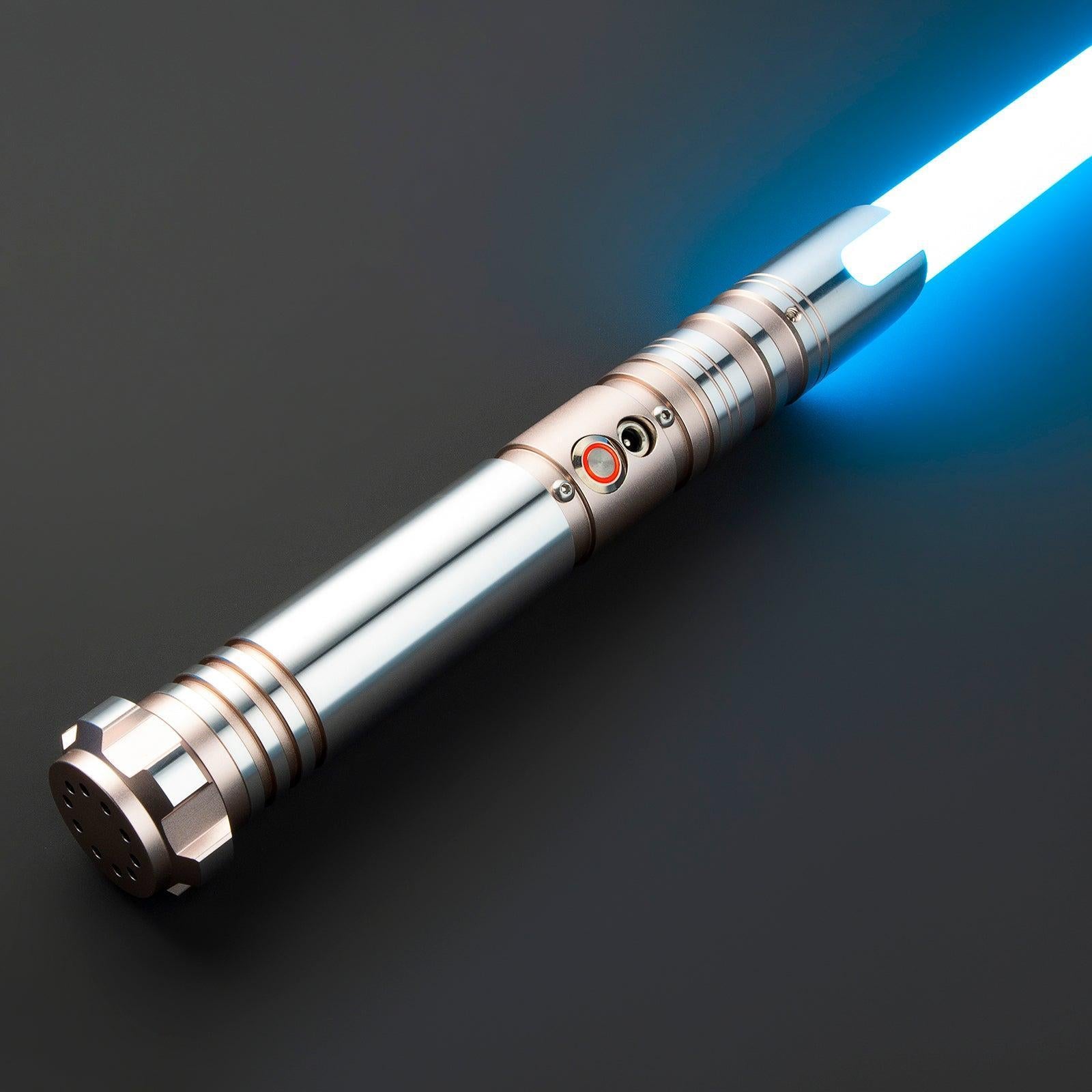 Das SL05 Lichtschwert aus der Elite-Serie sticht sofort ins Auge: Der komplett silberne Schaft verleiht dem Schwert einen cleanen, fast futuristischen Look, der durch den schräg angesetzten Emitter mit kantigen Spitzen kraftvoll betont wird. Die gerillte Griffzone sorgt trotz des glatten Finishs für sicheren Halt, selbst bei schnellen Bewegungen. Der markant geformte Pommel rundet das Design mit einer optischen Schwere ab und unterstützt die Balance. Ein echter Blickfang für alle, die in Deutschland ein Lichtschwert kaufen wollen, das Präsenz und Funktion ideal verbindet.